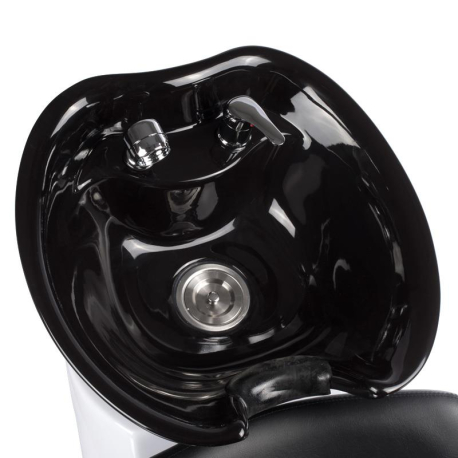 Mit ihrer klaren Linienführung und hochwertigen Verarbeitung verleiht die Waschstation jedem Salon ein exklusives Ambiente. Das Zusammenspiel von schwarzem Kunstleder, silbernen Akzenten und glänzender Keramik unterstreicht den modernen Charakter dieser Anlage.